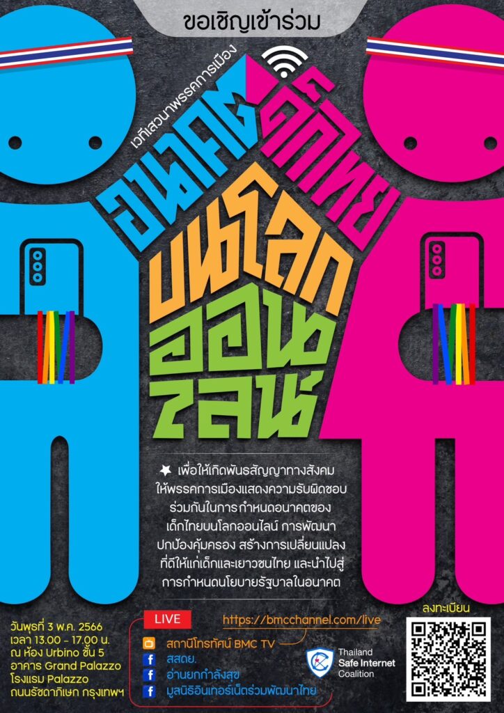 ขอเชิญชวนร่วมงานเสวนา เปิดวิสัยทัศน์พรรคการเมืองไทยกับนโยบายคุ้มครองเด็กบนโลกออนไลน์ อนาคตเด็กไทยจะเป็นอย่างไร เขิญชวนมาร่วมเรียกร้องและยื่นข้อเสนอเชิงนโยบายเพื่อนำไปจัดทำเป็นนโยบายของพรรค กันนะคะ เป็นโอกาสที่ท่านจะได้พูดคุยและเรียกร้อง เพื่อสร้างการเปลี่ยนแปลงในทางที่ดียิ่งขึ้นให้กับเด็กเยาวชนไทย