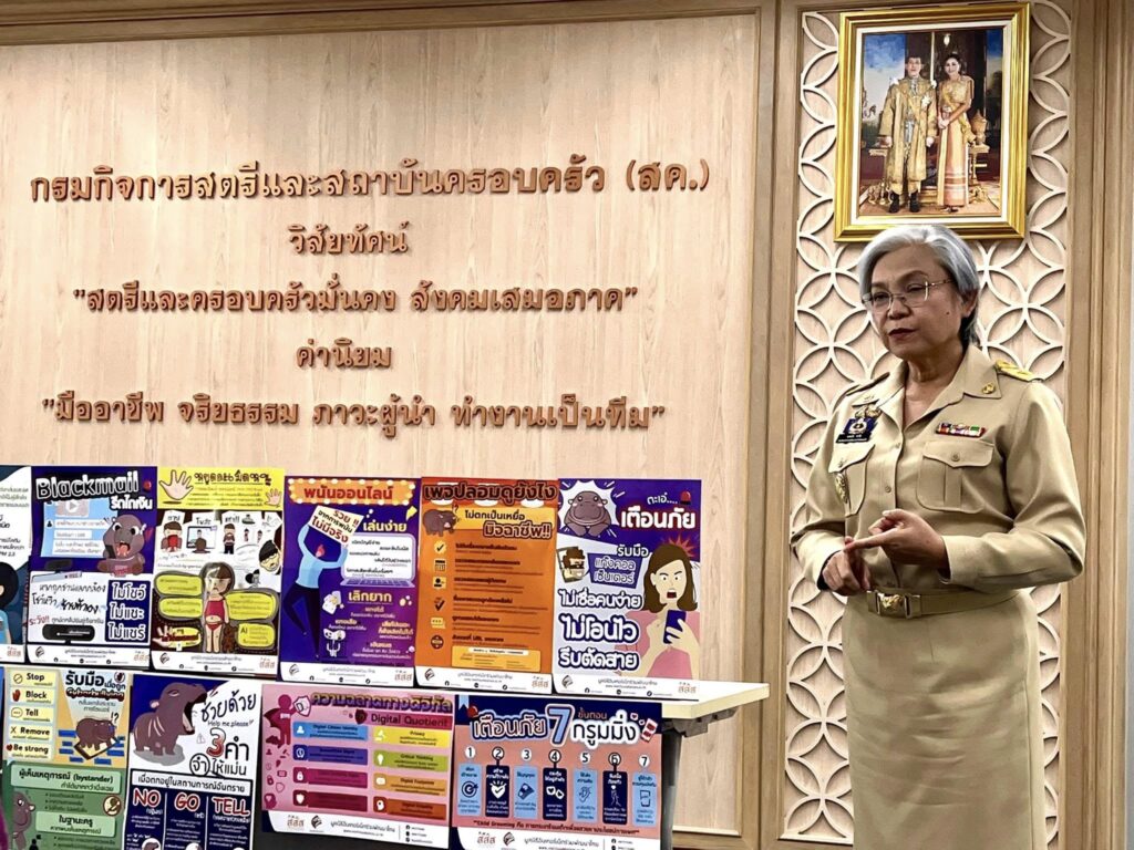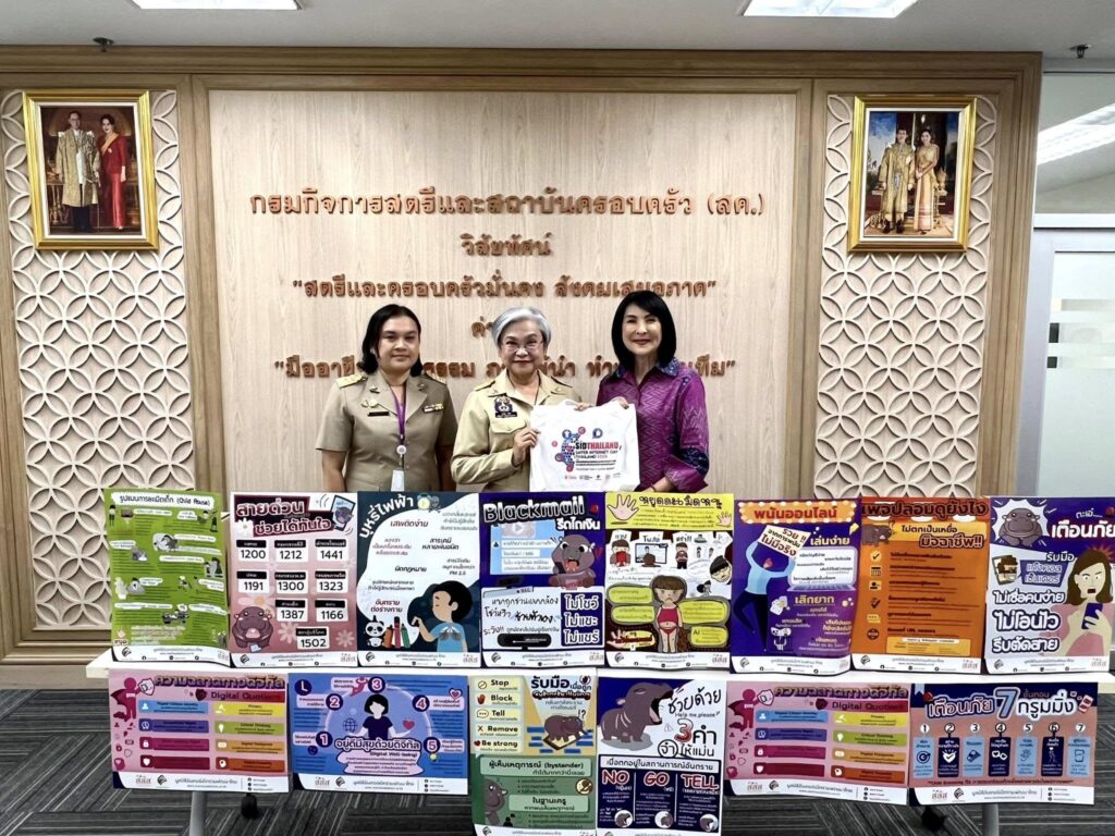 วันที่ 19 พฤษภาคม 2568 เวลา 16.00 น. นางสาวแรมรุ้ง วรวัธ อธิบดีกรมกิจการสตรีและสถาบันครอบครัว ให้การต้อนรับ ดร.ศรีดา ตันทะอธิพานิช และคณะ มูลนิธิอินเทอร์เน็ตร่วมพัฒนาไทย นำสื่อโปสเตอร์ที่เป็นความรู้เกี่ยวกับการระมัดระวังภัยทางออนไลน์ 15 หัวข้อ อาทิ ช่วยด้วยทันใจเบอร์โทรด่วน อยู่ดีมีสุขด้วยดิจิตอล หยุดละเมิดหนู พนันออนไลน์ เพจปลอมดูอย่างไร เตือนภัย 7 grooming เป็นต้น เพื่อให้กรมกิจการสตรีและสถาบันครอบครัวนำไปใช้ในการเผยแพร่ต่อให้กับครอบครัวกลุ่มเป้าหมายและเครือข่าย โดยผ่านศูนย์เรียนรู้การพัฒนาสตรีและครอบครัว 8 แห่ง สถานคุ้มครองและพัฒนาอาชีพ 4 แห่ง ทั่วประเทศ เพื่อร่วมกันเฝ้าระวังภัยทางออนไลน์ให้กับสังคมได้มีความปลอดภัยในชีวิตและทรัพย์สินต่อไป โดยมี นางนัฏญา วรชินา ผู้อำนวยการกองส่งเสริมสถาบันครอบครัว ข้าราชการ และเจ้าหน้าที่ สค. ร่วมให้การต้อนรับ ณ ห้องรับรอง ชั้น 12 กรมกิจการสตรีและสถาบันครอบครัว