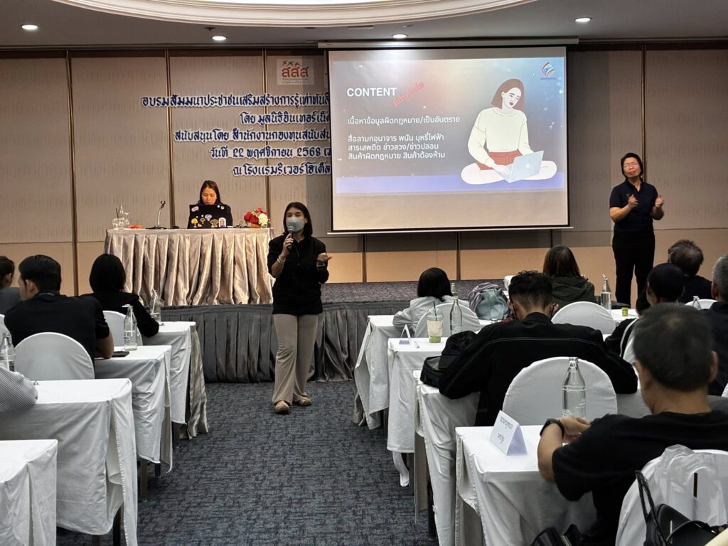 เมื่อวันที่ 22 พฤศจิกายน 2568 ณ ห้องศรีสง่า โรงแรมริเวอร์ จังหวัดนครปฐม มูลนิธิอินเทอร์เน็ตเพื่อการพัฒนาไทย (มูลนิธิอินเทอร์เน็ต) ได้จัดกิจกรรมสัมมนาเชิงปฏิบัติการเพื่อ สร้างการรู้เท่าทันสื่อ ป้องกันและปราบปรามภัยออนไลน์ ให้กับกลุ่มเป้าหมายสำคัญกว่า 100 คน ประกอบด้วย พ่อแม่ผู้ปกครอง ครู และกลุ่มผู้พิการทางการได้ยิน