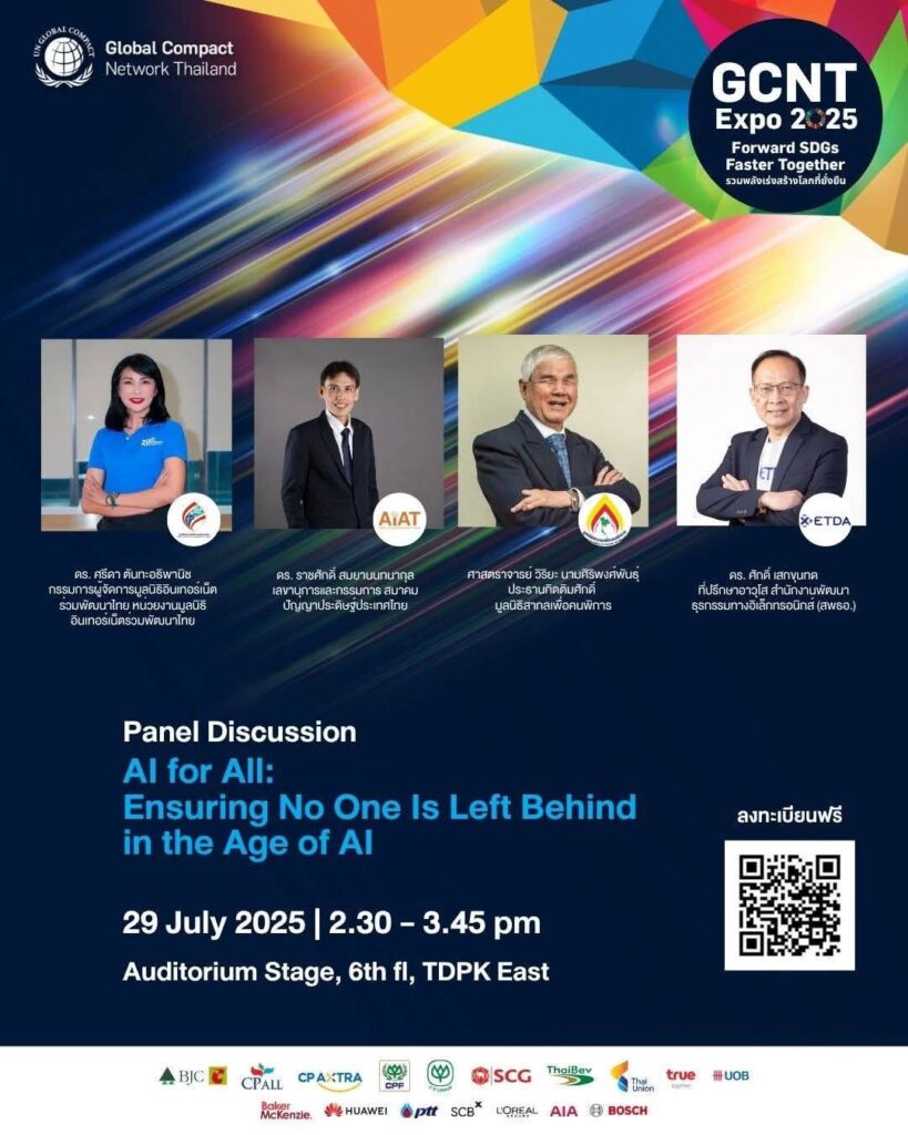 ดร.ศรีดา ตันทะอธิพานิช กรรมการผู้จัดการมูลนิธิอินเทอร์เน็ตร่วมพัฒนาไทย ได้เข้าร่วมเป็นวิทยากร ในงาน GCNT Expo 2025 เรื่อง AI for All: Ensuring No One Is Left Behind in the Age of AI จัดขึ้นระหว่างวันที่ 29–31 กรกฎาคม 2568 ณ True Digital Park กรุงเทพมหานคร เป็นเวทีรวมพลังขององค์กรเอกชน ภาครัฐ และภาควิชาการ เพื่อร่วมกันผลักดันเป้าหมายการพัฒนาที่ยั่งยืน (SDGs) ขององค์การสหประชาชาติให้บรรลุผลภายในปี 2573 ภายใต้แนวคิด “Forward SDGs Faster Together” งานนี้จัดโดย Global Compact Network Thailand (GCNT)